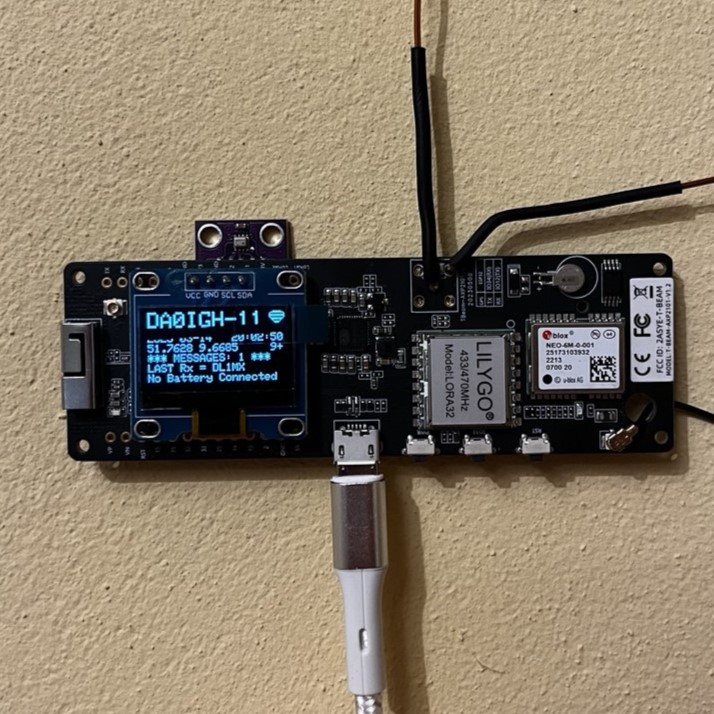 Ein LoRA-APRS Tracker mit dem Rufzeichen DAØIGH-11 ist ebenfalls an Board. Wir verwenden hier einen T-Beam der die Geschwindigkeit, Höhe, Luftdruck und Temperatur überträgt. Zusätzlich wird noch die Anzahl der empfangenen Satelliten angezeigt. Man kann die Daten bei APRS.fi abfragen. Da die Übermittlung der Daten etwa alle 2 min. erfolgt, ist eine recht zeitgenaue Verfolgung möglich.